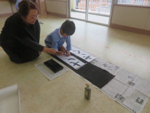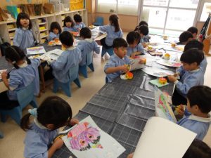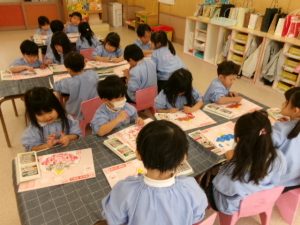 先生と一緒に、長い紙に卒園作品を♫