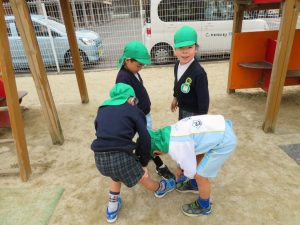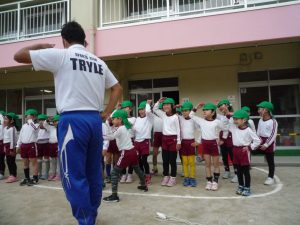 年長組担任と名前の練習をしました。